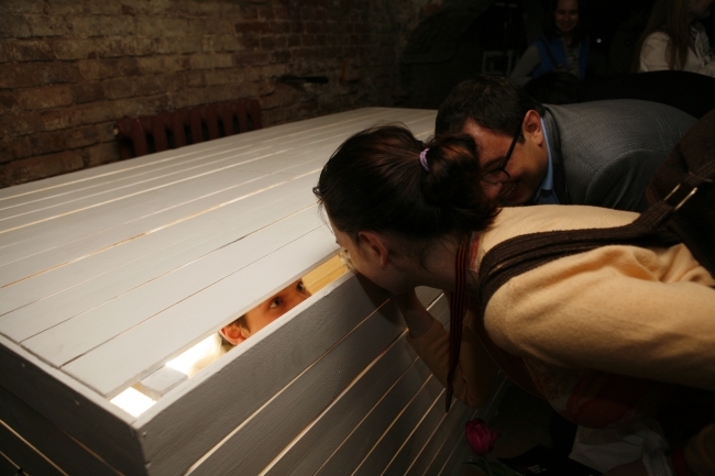 Поэтический перформанс «Красная ветка» играется в подвале Акцизного склада Винзавода – сумрачном, длинном, с потрескавшимися арочными сводами и слегка облупленной кирпичной кладкой. Зрителям открывают решётчатые ворота, и, как только они входят, на плечи каждого вдруг опускаются чьи-то руки. Каждый из актёров собирает вокруг себя группки по два-три человека, уводит в сторону и начинает им читать стихи – глаза в глаза, пристально смотря в лица, по-родственному доверительно, будто не чужим людям, а друзьям детства. Когда первое стихотворение закончено, ты свободен, пока тебя не выцепит взглядом ещё кто-то, ходишь среди толпы и пытаешься вслушаться в строки, которые произносят другим. Приближаешься к продолговатому дощатому ящику и вдруг видишь сквозь прорези чьи-то глаза. Нагибаешься, приникаешь ухом к щёлочке, и неведомый голос страстно выплёскивает в тебя свою боль, отчаяние, ненависть. А потом погаснет свет, и актёры будут выхватывать людей уже по одному, тесно прижимаясь всем телом, дыша в висок и рассказывая стихи дрожащим шёпотом, как сказку на ночь.