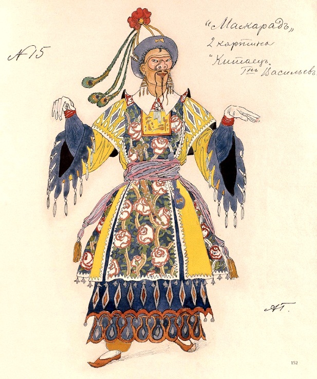 Для Марии Головиной воссоздание костюма Китайца из спектакля «Маскарад» — дипломная работа, подводящая итог её обучению на художника по костюмам. Она рассказывает о своём творении поначалу уверенно, потом местами чуть сбивчиво, но главное – искренне. Рассказывает о технологии изготовления костюма и аксессуаров, о процессе приобретения тканей и работе над ними, иллюстрируя свой рассказ слайдами с изображением эскизов Александра Головина, наконец, представляет и сам костюм. Долгожданно. Завораживающе. Издалека слышится звон колокольчиков, приближаясь, усиливается, и мы видим молодого человека в костюме Китайца.