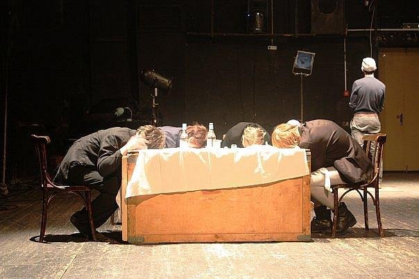 Компания обитателей «палаты» — шесть полифоничных и, в сущности, бесполых персонажей – вот они под клубную музыку пляшут в «Фиделе» (условно), вот они пьют водку на кухне, вот они рассуждают о судьбах родины и о бессмертии души. Этакая чеховская группа лиц без центра (пятерых из них исполняют артисты — Дарья Степанова, Валерий Степанов, Андрей Папанин, Артём Хвостеев, Олег Коваленко), а шестой персонаж – набитый мешок – тюфяк, туловище. К слову, мешок является полноправным членом общества, он – часть каждой мизансцены, наравне с живыми артистами — он сидит за столом вместе со всеми, более того, когда приходит его очередь произнести спич, он продолжительно молчит с кафедры…