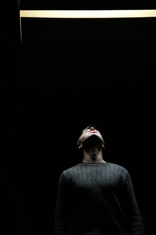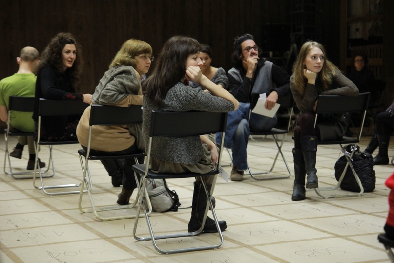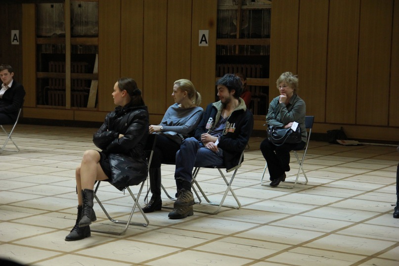 Лабораторию отличало то, что актеры и зрители существовали в условно разделенном пространстве. И речь шла не просто о несоблюдении правила четвертой стены, а о том, чтобы зачастую и вовсе отменить противопоставление актер-зритель. В ряде эпизодов зрители становились соучастниками «процесса». Интерактивность была поддержана и пространственным решением. В огромном зале, разделенном по горизонтали квадратом подвесных светильников, оформленных в картонные короба, на картонном настиле, разлинованным на пронумерованные клетки, было разыграно восемь эпизодов – глав из романа Франца Кафки. Складные стулья – единственный реквизит, используемый актерами и зрителями для перемены мизансцен. Для каждого эпизода была придумана своя диспозиция, поэтому финальный показ, в котором все они были собраны воедино, напоминал квест. Зрителям раздавались подшивки талончиков, на каждом из которых было указано название эпизода, имя режиссера, и клетка, которую полагалось занять вместе со своим стулом. Таким образом, в каждом последующем эпизоде пространство трансформировалось за счет зрительских перемещений, а не ухищрений сценографа. Вдобавок, не актер, а именно зритель оказывался привязанным к реквизиту (собственному стулу), что и провоцировало его на невольное построение мизансцены. Эксперимент был особенно интересен тем, что не только актеры, не задействованные в текущем эпизоде, сливались с публикой, но и некоторые из тех, кто участвовал в действии, был «приписан» к своему стулу. В такой ситуации зрительская реакция – изучение сменившейся благодаря им самим мизансцены, попытка развернуться к актеру, настроиться на изменившиеся условия игры – становилась частью перформанса. Зритель выступал в «Процессе» в роли свидетеля и соучастника, была воплощена идея шехнеровского shared space (общего для актера и зрителя пространства).