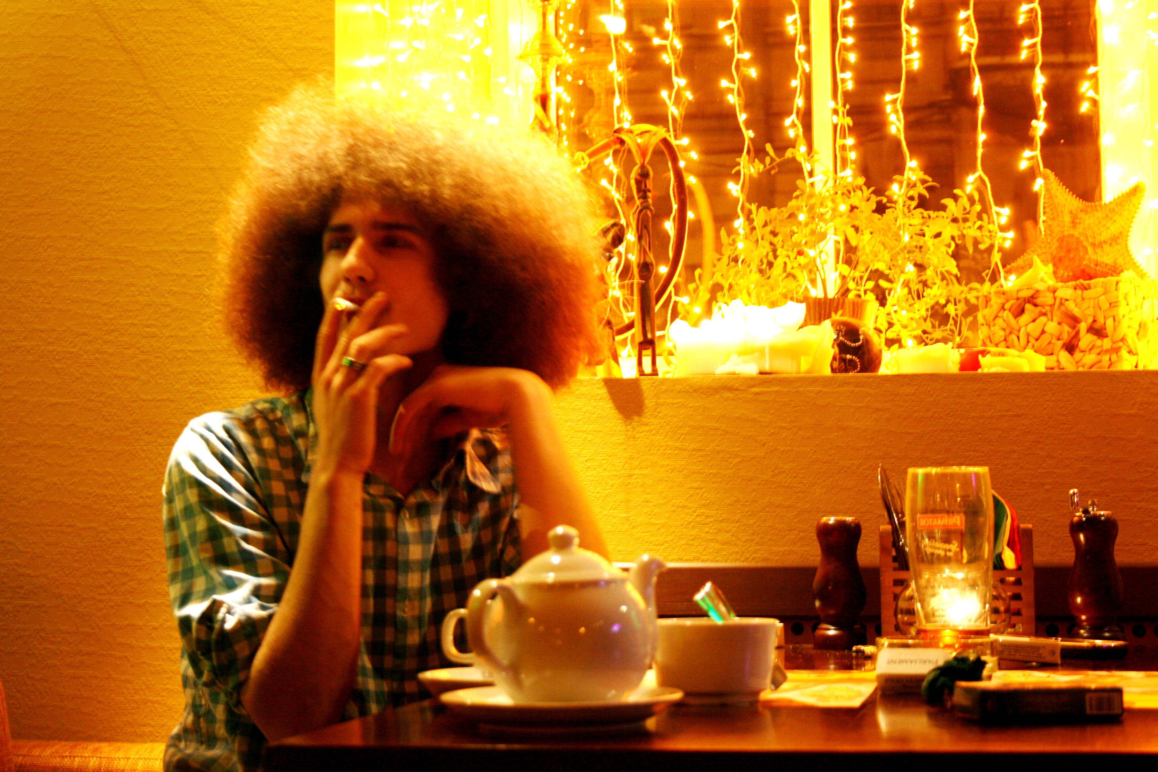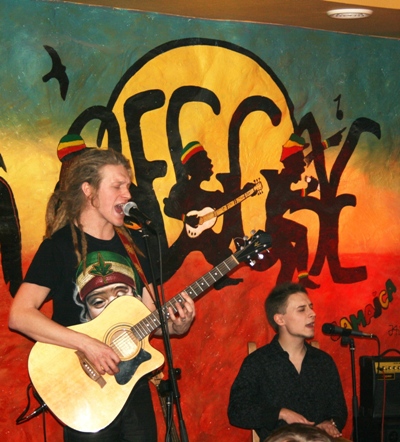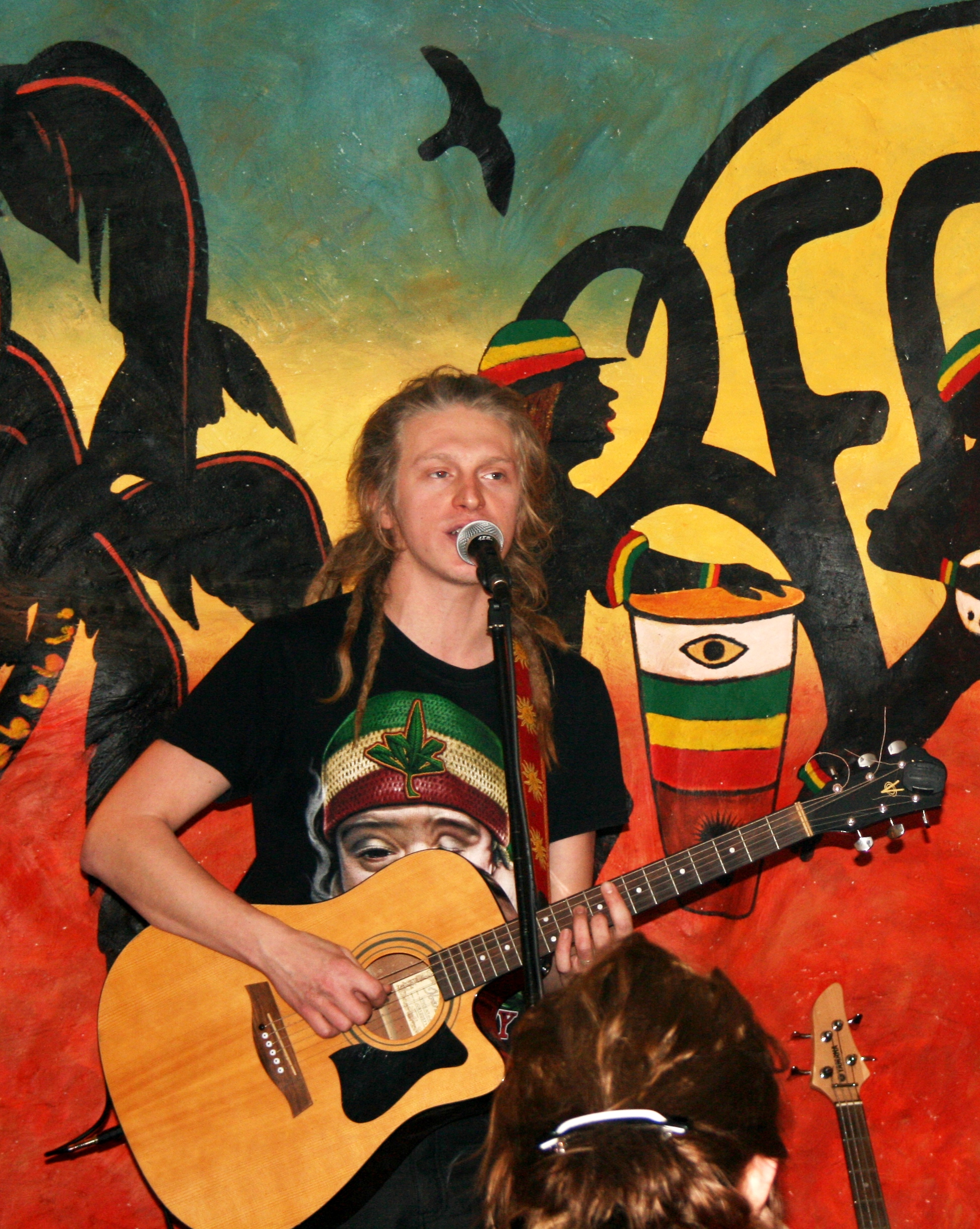 Для начала о месте, в котором проходил концерт. Хотя, скорее это была своего рода посиделка, чуть ли не квартирник. Такие ассоциации возникают благодаря атмосфере в «Happy Bob». Подвальчик на 7-ой Советской — это подобие небольшой квартиры с двумя залами, выдержанной в светлых тонах ямайских пляжей. Всюду развешены картинки, фотографии Боба Марли, плакаты и флаги, все это — почти что семейные фотографии. Здесь повсюду колоритные люди: официантки и официанты, гости — такое количество дредов в замкнутом пространстве можно увидеть в этом городе разве что на регги-сейшн…
