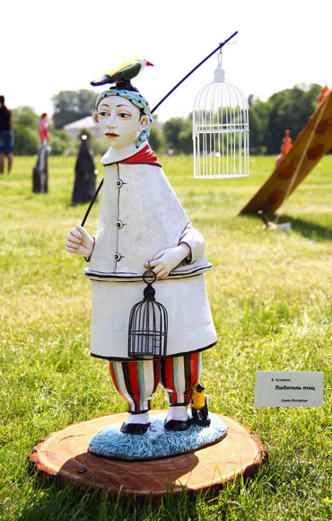 Другие расширили ассоциативный ряд — и перед зрителем на траве оказались поэт, внимающий музе, «Любитель птиц» (Е. Сухарева) — эдакий Пьеро с пустой клеткой, маленькие города, человек, звенящий в колокол, свисающий с небе