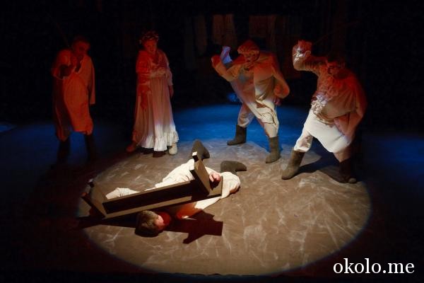Герои пьесы одеты в белое, на лицах господ гротескный неестественно белый грим, что превращает их в уродливые бездушные маски. Вид комичный, но порою даже жуткий! В сцене, где «великие основатели острога» плетьми стегают мужика, начинают мурашки бегать по коже от вида живых мертвецов, холодных и бесчувственных, от ударов хлыстов, словно и вправду оставляющих кровавые рубцы на коже крестьянина.