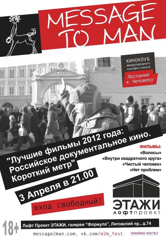 3 апреля в 21:00 в галерее Формула (4 этаж Лофт Проекта ЭТАЖИ) пройдет бесплатный показ трех российских документальных фильмов 2012 года. Киноклуб «Послание к Человеку» создан для того, чтобы у петербуржцев появилась возможность еще раз увидеть лучшие фильмы из коллекции кинофестиваля. В этот раз будут показаны фильмы: «Волосы» (реж. Анна Драницына, 2012. 32 мин.), «Внутри квадратного круга» (реж. Валерий Шевченко, 2011. 26 мин.) и «Нет проблем» (реж. Таисия Решетникова, 2012. 23 мин). Лофт Проект Этажи (Лиговский пр., 74)