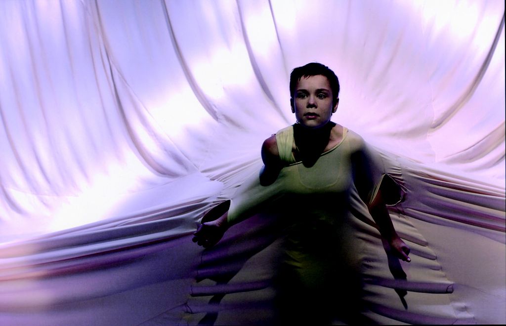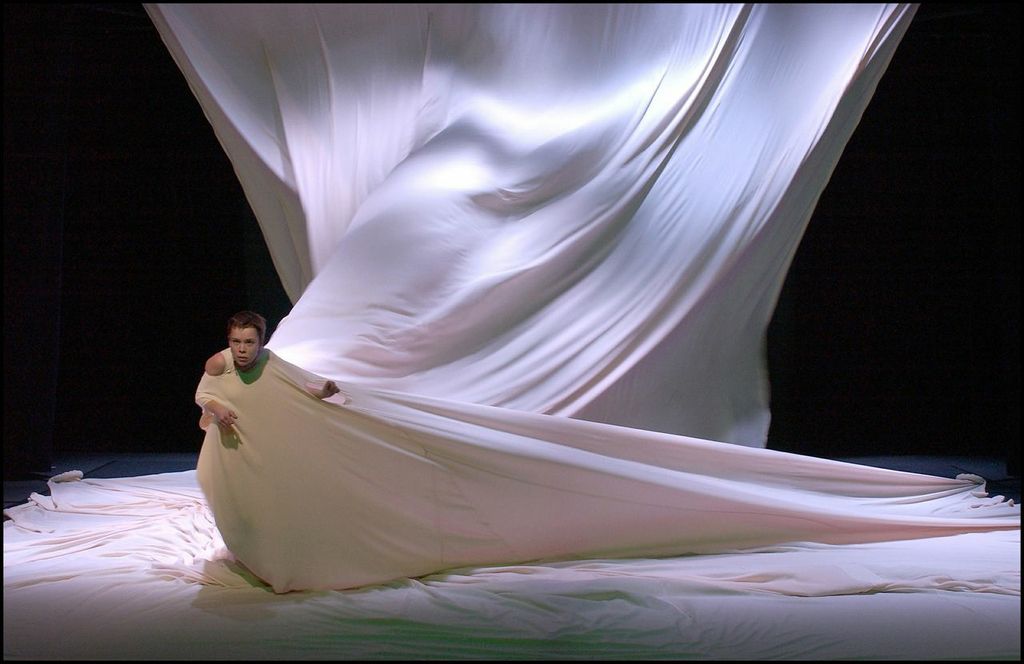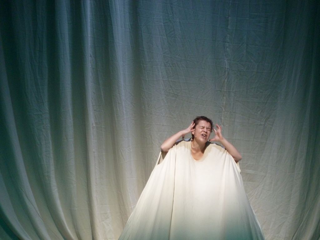 Режиссер Анн Терон необычно подошла к решению темы спектакля. Сцена задекорирована огромным белым покровом, через прорези которого выглядывают лишь руки и голова героини, силуэт утопает в складках ткани. Материя окутывает ее словно цепи, напоминая ей о неволе, о тщетности попыток выбраться из того ужаса, на который обрекла ее мать. Героиня сворачивается в клубок, ложится, когда силы оставляют ее, и встает, как только появляется какая-либо надежда, чтобы потом снова, когда узы данного ею против воли обета натянуться, не давая ей шанса избавиться от них, снова упасть в бездну, которая поглотит ее, накрыв новыми лишениями и горестями.