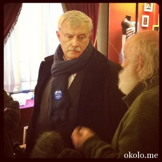В ходе встречи Полунин подарил губернатору синий значок с усатым смайликом. «В интернете говорят, похож на Вас», — пояснил артист. Градоначальник признал, что похож, и прикрепил значок к своему шарфу.