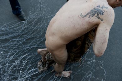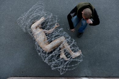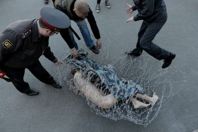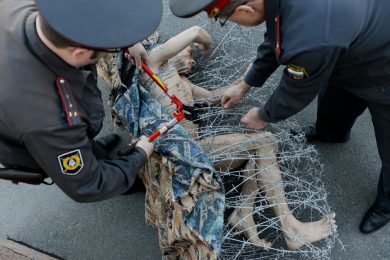Павеленский разделся донага, обмотался колючей проволокой и лег на асфальт. Через 20 минут на место акции приехали полицейские, которые разрезали колючую проволоку. Мужчину отнесли в здание Законодательного собрания, ему вызвали «скорую помощь». Сторонники художника заявили: «Акция символизирует существование человека в репрессивной законодательной системе, где любое движение вызывает жестокую реакцию закона, впивающегося в тело индивида. Это метафора животной покорности, «выученной беспомощности» человека в загоне государственной машины».