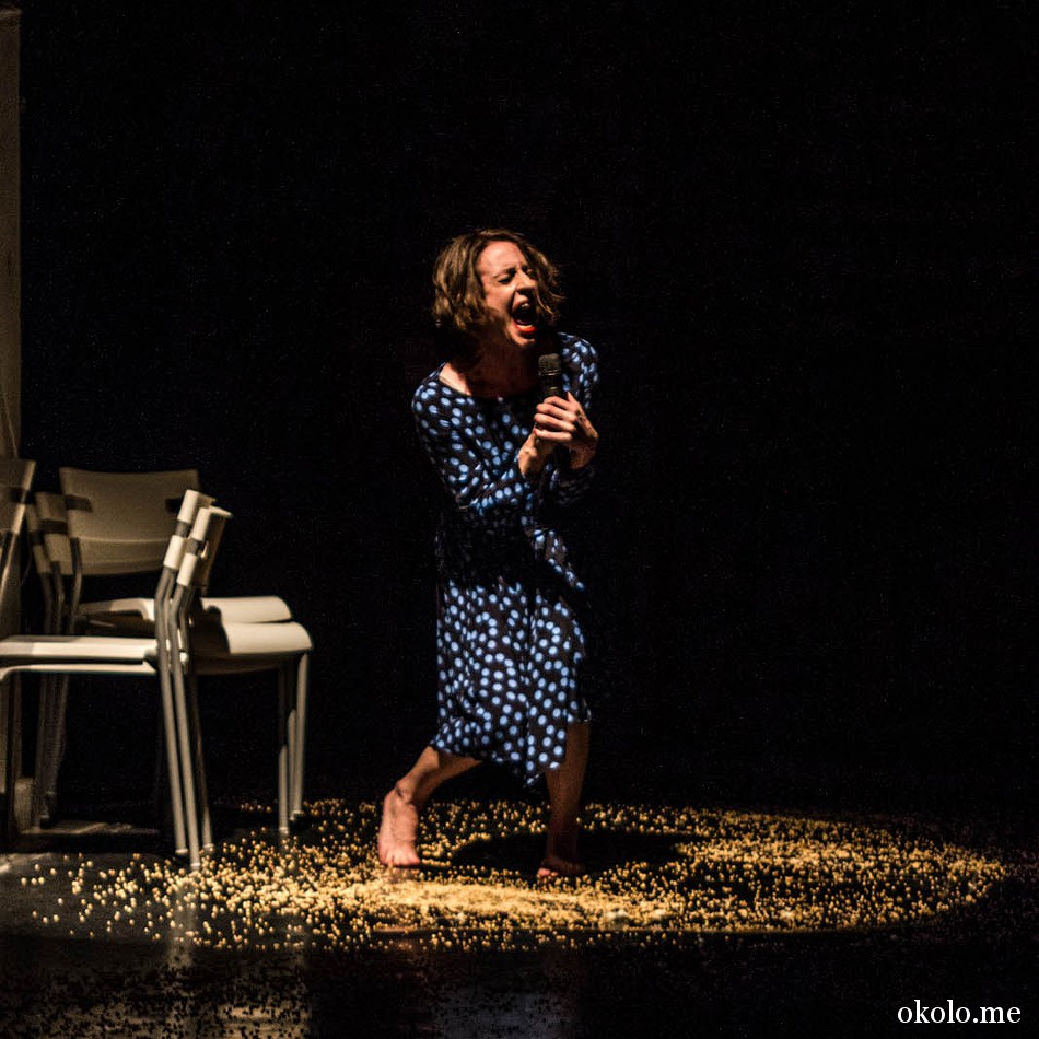Этот спектакль об одиночестве и бесплодных попытках, о Сизифовом труде, когда герой несёт суму с горохом, который постепенно высыпается, но он, будто бы не замечая этого, продолжает брести… Куда? Зачем? Под конец он взрывается мерными, но яростными ударами по игрушечному барабану, а безымянная героиня отчаянно поёт-кричит что-то в микрофон.