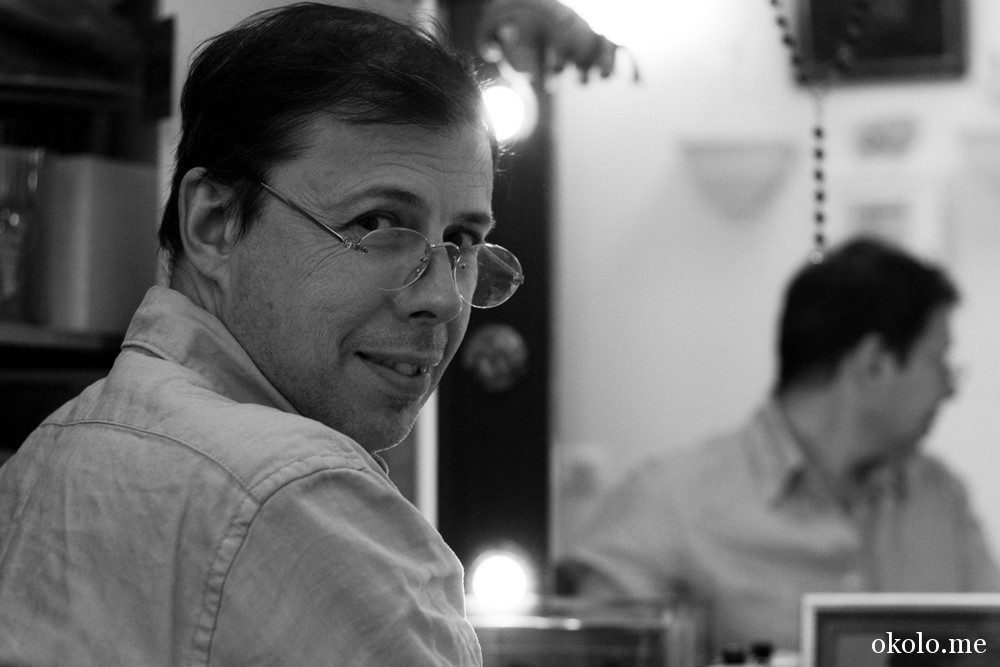 Первым делом, пройдя длинными белыми коридорами, мы попадаем в святая святых: личную гримерку заслуженного артиста России Сергея Магиленича. Сергей работает в театре с самого окончания ЛГИ театра, музыки и кинематографии. В репертуаре Магиленича самые разнообразные роли. Он и миллионер Корейко из мюзикла «Великий комбинатор», и Дон Карлос из «Дон Жуана», и даже легендарный поэт Эзоп. В гримерке артиста очень уютно, его окружают маски, фотографии и принадлежности для грима.