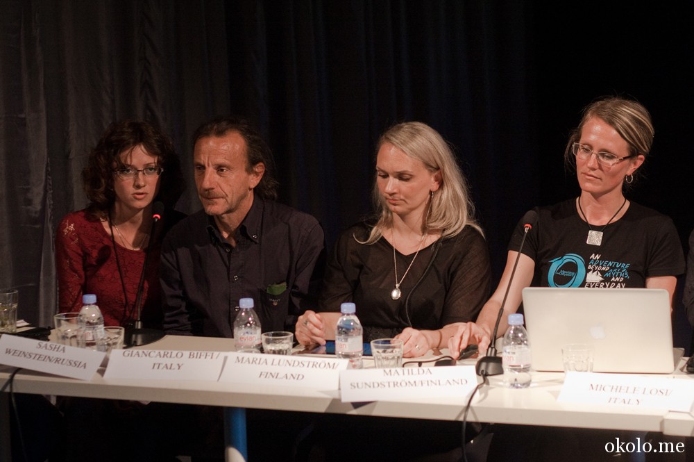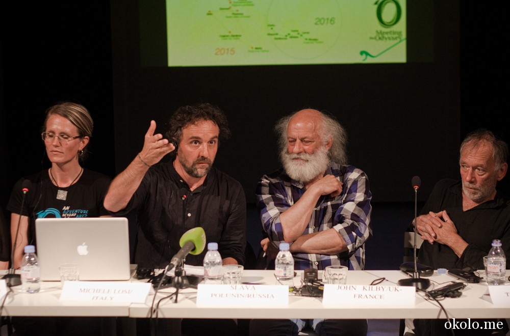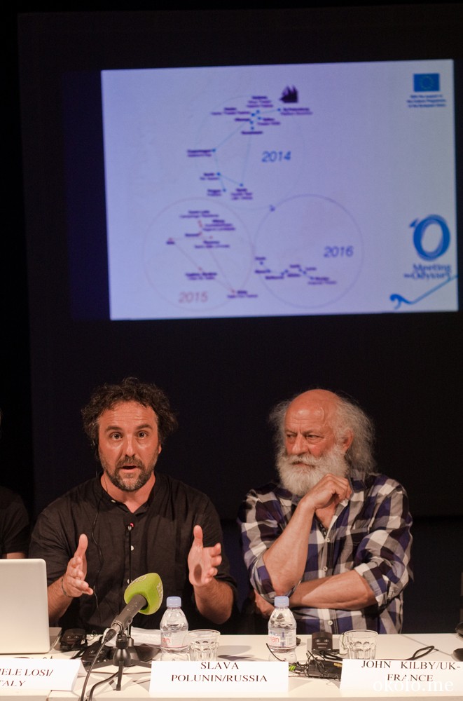 На пресс-конференции, прошедшей в рамках проекта «Здесь и сейчас» и плавно перетекшей в Круглый стол, были организаторы и идеологи проектов «Встречая Одиссею» (Микеле Лози и Джанкарло Биффи из Италии, Матильда Суднстрём и Мария Лундрстём из Финляндии, Александр Вайнштейн и Татьяна Прияткина из России) и «Караван Мира» (Вячеслав Полунин, Наталья Табачникова — российские представители , Джон Килби — представитель Великобритании.