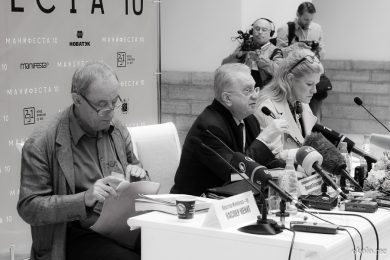 За несколько дней до официального открытия выставки представители «Манифесты» и Эрмитажа встретились с журналистами в атриуме Главного штаба. Михаил Борисович Пиотровский и директор фонда «Манифеста» Хедвиг Фейен произнесли приветственные речи и ответили на немногочисленные вопросы журналистов, связанные, в основном, с украинским конфликтом, под безусловным влиянием которого проходят все крупные культурные события. Наиболее интересным и вдохновляющим стало выступление Каспера Кёнига, куратора биеннале, который сделал акцент на том, что «Манифеста» – это процесс, и это – «Манифеста» без манифеста: пространство свободное для дискуссий, интерпретаций и творческого поиска. Организаторы не пытаются донести до посетителей биеннале никакой конкретной идеи, они лишь наблюдают за взаимодействием разных форм искусства в отдельно взятой среде и предлагают посетителям к ним присоединиться.