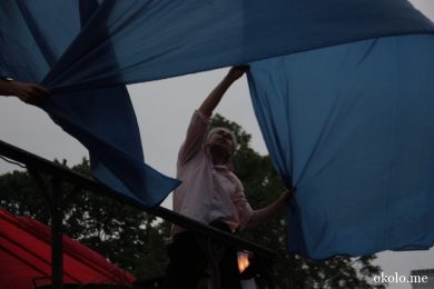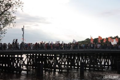 В итоге вся эта процессия с флагами, песнями и плясками направилась от метро по мосту на Елагин остров — в сторону сцены, оборудованной возле Елагина дворца, газон перед которым в честь праздника украсили большими цветными воздушными шарами.
