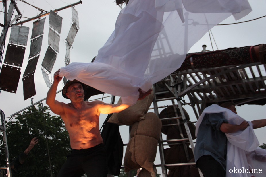 Без слов, только на сильной режиссерской и актерской работе. И еще на мощном взаимодействии со зрителем, при котором если уж нести огонь, так по импровизированному залу, и если уж направлять корабль, так прямо в центр толпы. Чтобы не осталось ни заскучавших, ни равнодушных.