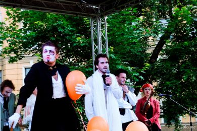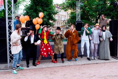 В такой важный день многие известные писатели и поэты решили повидать Федю: тут и еще один мистик Коля Гоголь, и большой человеколюб Лева Толстой, и моложавый Мишаня Лермонтов. Медведь на пару с клоуном тоже не смогли пройти мимо. Ну и Александр Сергеевич решил сплясать нижний брейк по такому случаю. Все эти персонажи участвовали в перфомансе «Ликование падших». Нестандартность происходящего подкреплялась тем, что шумное веселье праздника пересекалось со страданием и болью и персонажей Достоевского, и его самого. Как кричал он из гроба: «Вы улыбаетесь, а я не могу, во мне много боли моих персонажей!». Немного погрустив во время панихиды по безвременно восставшему и выпив воображаемую рюмку водки, гости решили, что пора бы и повеселиться. Тут наши классики на славу «отожгли»! Исполнив заводную песню «Достоевский есть!», Коля, Миша, Лева и остальные показали, что и у них еще хватает пороху в пороховницах. Дети, скакавшие в первых рядах зрителей, пришли в восторг, а пришедшие взрослые, наконец, раскачались по-настоящему. Это яркое представление, прошедшее на площади Кулибина, было подготовлены молодыми, но яркими и талантливыми артистами «Этюд-Театра», Мастерской Р.Р. Кудашова (БТК) и ребятами, представлявшими «Цехъ Свободных художников».