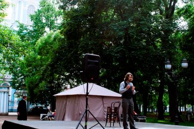 Переместившись в сквер у Никольского собора, можно было послушать монологи героев Ф.М. Достоевского. Здесь мы услышали рассказ о Петре Покровском – герое вставной автобиографической повести Вареньки Доброселовой из книги «Бедные люди», историю влюбленной юной девушки Настеньки из рассказа «Белые ночи», а также монолог Неточки Незвановой, обращенный к отцу. Этот моно-подарок публике сделали артисты Государственной филармонии Санкт-Петербурга для детей и юношества.