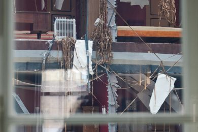 Пройдя в следующий зал, а, точнее, в один из внутренних дворов Главного штаба, вы увидите инсталляцию «Срез», созданную Томасом Хиршхорном. Художник соорудил разрушенный страшной катастрофой фасад трехэтажного здания: перед изумленным зрителем шесть комнат, украшенные подлинниками Малевича, Филонова и Розановой из коллекции Русского музея. Вдохновила художника фотография здания, разрушенного ураганом «Катрина».
