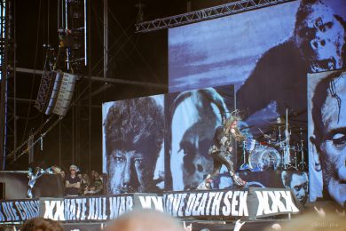 Ну а полях Хэллфэста готовились к сбору главной жатвы. Начинался Slayer. Лучший свет, минимум слов от Арайи, максимум скорости. Сил многим уже не хватало, но именно тут расслабиться, увы, невозможно! Gary Holt зарос бородой похлеще Тома и был как всегда безукоризнен, но до сих пор как-то грустно… Я уверен, что если бы Slayer захотелось сыграть эдак в 5 утра, количество народу бы не уменьшилось. Порадовало и исполнение абсолютно новой песни «Implode».