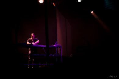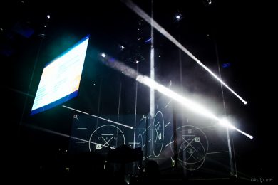 Сперва публику старательно прессовал «эфемерный» музыкант Антон Маскелиаде. Утомил изрядно. Чтобы оценить весь спектр его таланта требуется минут 10, не более, а парень трудился почти добрый час. Звуки он издаёт с помощью примочки Leap Motion, изгибаясь в страшных конвульсиях за столиком на сцене . Выглядит это весьма занятно, но нельзя сказать, что сильно цепляет. Впрочем, футболка с принтом фильма «Пила» у него клёвая, а внешнее сходство с актёром Джесси Айзенбергом поразительное, издалека так вообще не отличить.