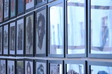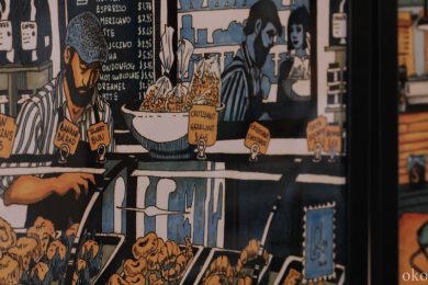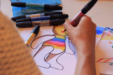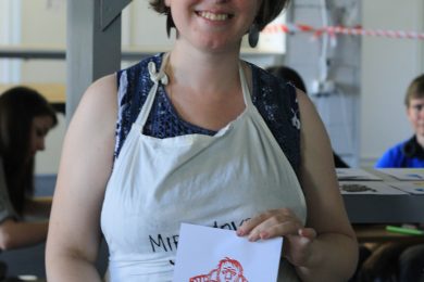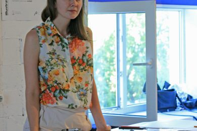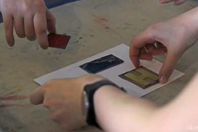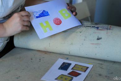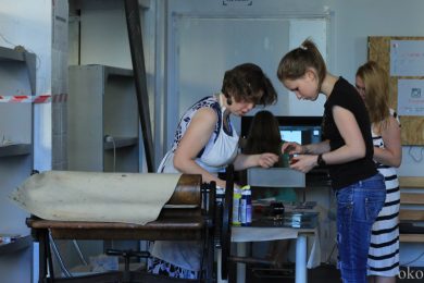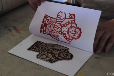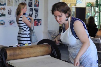 Особым спросом в день иллюстратора пользовалась упомянутая линогравюра. Название происходит от основы отпечатка – линолеума. Используя офортный станок и краску для него же (или на водной основе) можно было самостоятельно, но не без доброго присмотра, изготовить грустных викингов, абстрактные картины, написать пару слов. А все только по мгновению жесткого валика и прокатного станка. Зато сколько удовольствия! Вырезание основ для линогравюры – занятие, безусловно, медитативное, как призналась «Около» Марина Шарова, хозяйка мини-мастерской в этот день. Ножички, кстати, можно приобрести в обычном художественном магазине и неспешна, отдыхая за кропотливым занятием, вырезать свои собственные будущие шедевры. Самим же производством линогравюры заведует Олеся Нарыжная в школе иллюстрации Miroedova School – главного партнёра фестиваля.