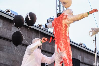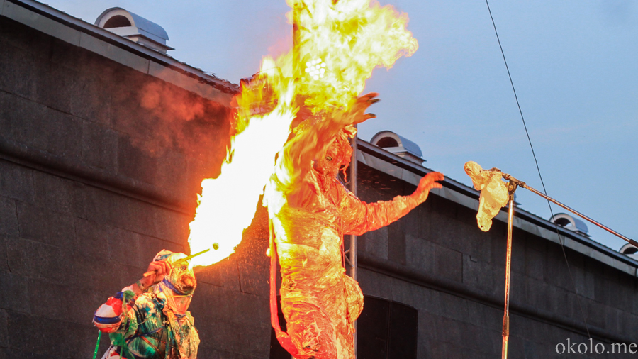 В театре АХЕ уже и не разобрать: артист перед вами или художник, или иное творческое воплощение той или иной мысли. В любом случае, специфика выступления бойких мужчин с бородой – крайность (в прямом и в переносном смысле слова). Конструкция сцены, на которой в этот раз имел место своеобразный перфоманс – подиум, на конце которого находились на протяжении всего представление участники.