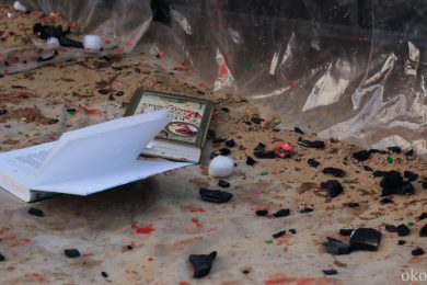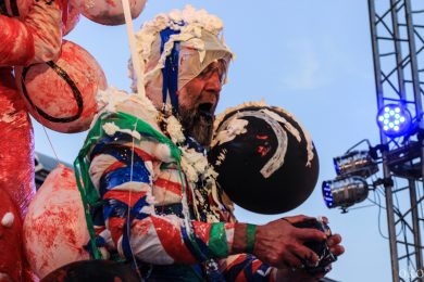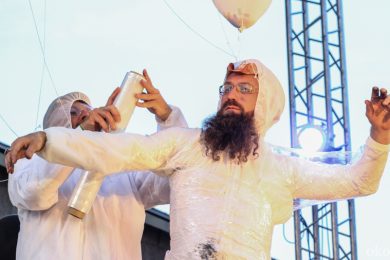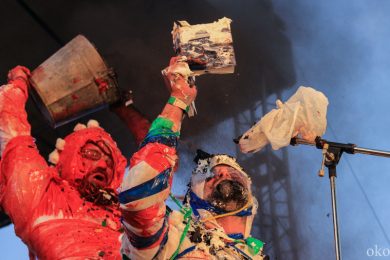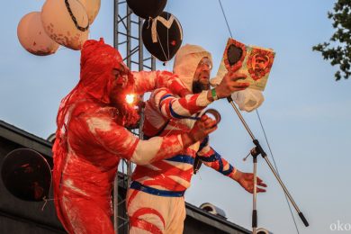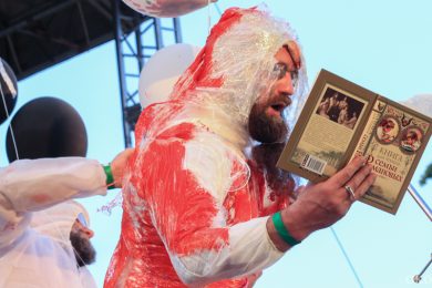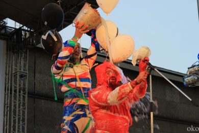 Как и у девушек из ИВА-НОВА, у ребят из АХЕ в ход также шло практически всё. Ребята разукрашивали открытое сознание, да и себя самих, то стикерами, то краской, то горячей лапшой, от которой раздаются болезненные вопли, а то и вовсе били друг о друга бутылки шампанского. Весь арсенал был спрятан в пакеты, развешенные по обе стороны подиума. Над головами выступающих то кружилось облако золы, то красный дым обволакивал думы, и стремглав летел на ту сторону Невы. Дети гостей фестиваля были также не против подкрасить участников: подбирая с земли баллоны или ватные шарики, они направляли свои творческие порывы прямо на ноги выступающих. АХЕ – это не только неожиданные «красящие» материалы, но и такое же внезапное содержания книг об истории Романовых или Ленине. Вместо научных исторических текстов из уст читающих звучат своеобразные манифесты благодарности – раскрашенные скептики говорят спасибо то отражению, что делает нас заметными, то музыке, которая делает нас подобными. Каждые строки построены на абсурде: так пустоту АХЕ благодарит в первую очередь за наполненность, например, среди субтитров и фильмов в формате 3D.