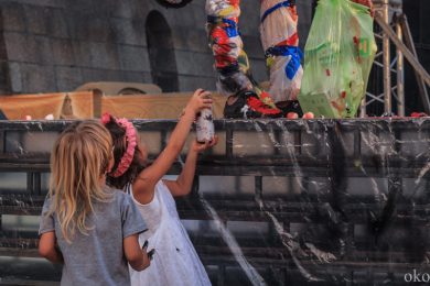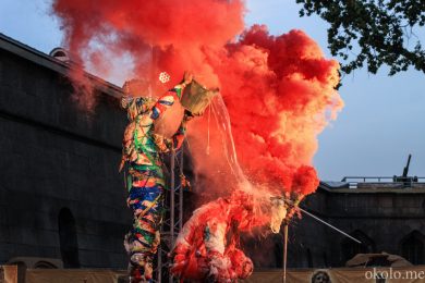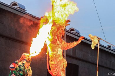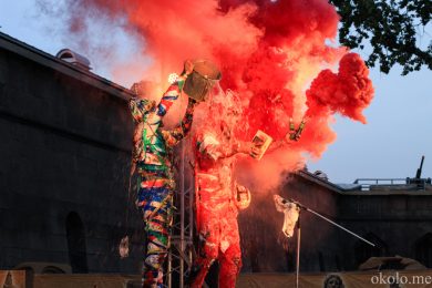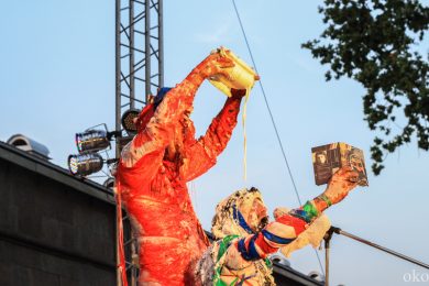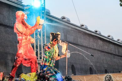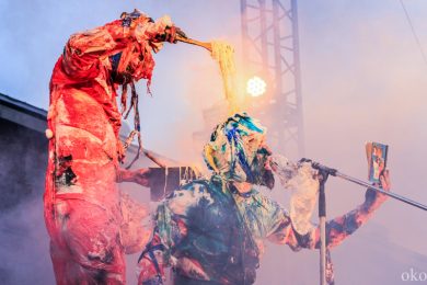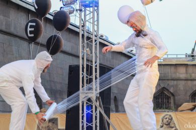 Упомянутую дружбу коллективов подтверждает и то, что музыкальное оформление выступления АХЕ тоже отчасти на плечах хрупких девушек. Наталия Потапенко (аккордеон) и Екатерина Фёдорова (ударные) составили компанию другим двум музыкально-электрическим магам АХЕ. Театр буквально строится на сюрпризах. Представленный спектакль «Монохром» имеет способность хамелеона и подстраивается под любое событие, каждый раз находя всё новые способы завершения представления. В этот раз свой конец «Монохром» обнаружил в водной глади Невы.