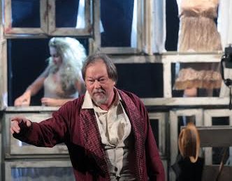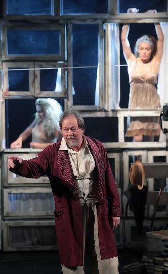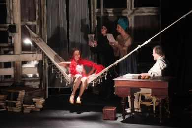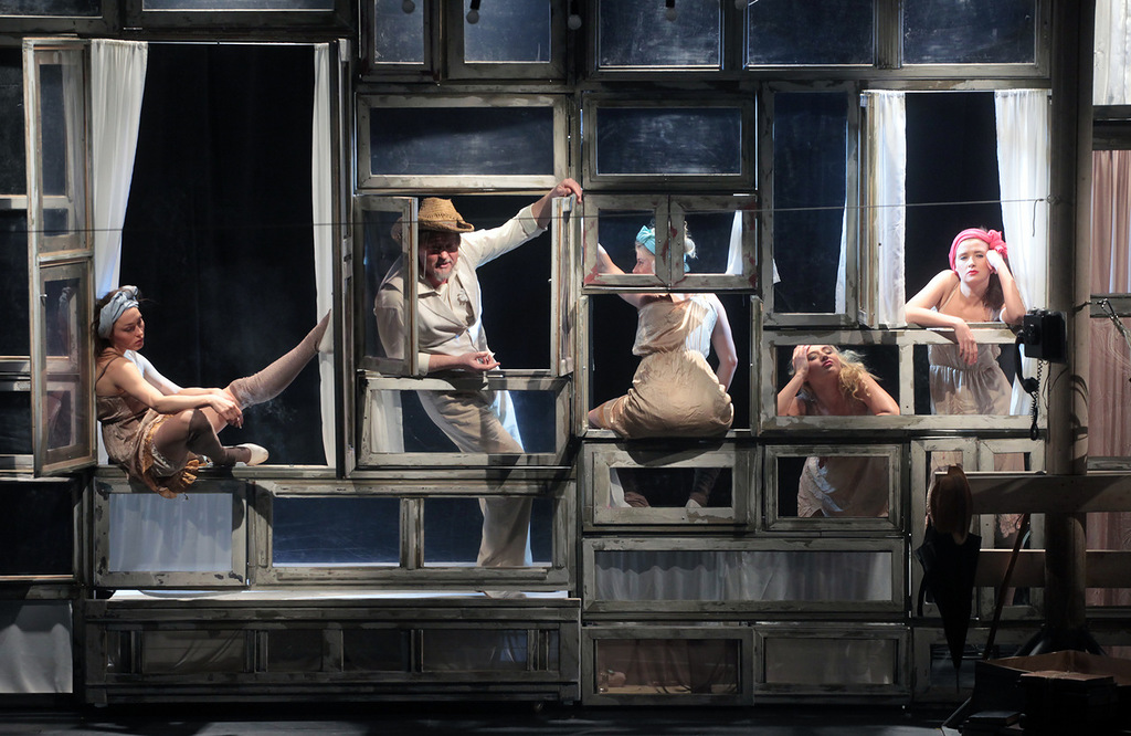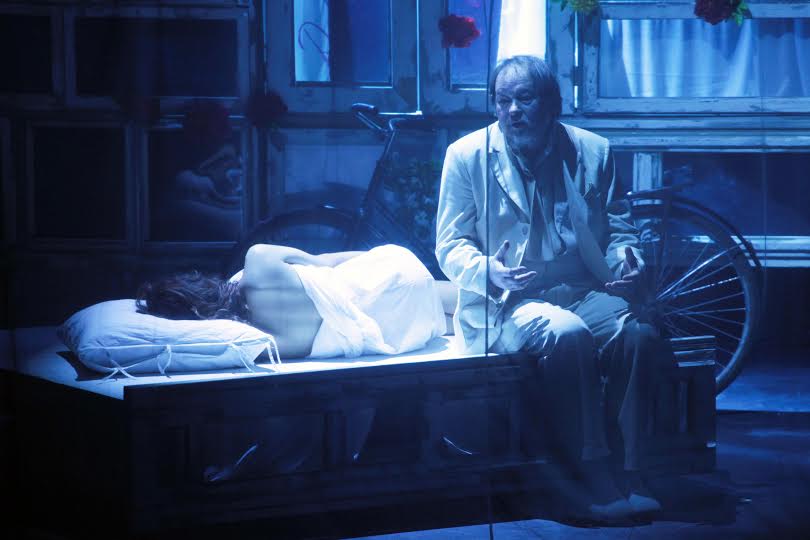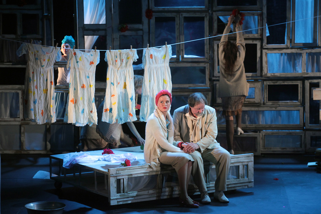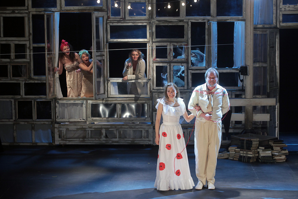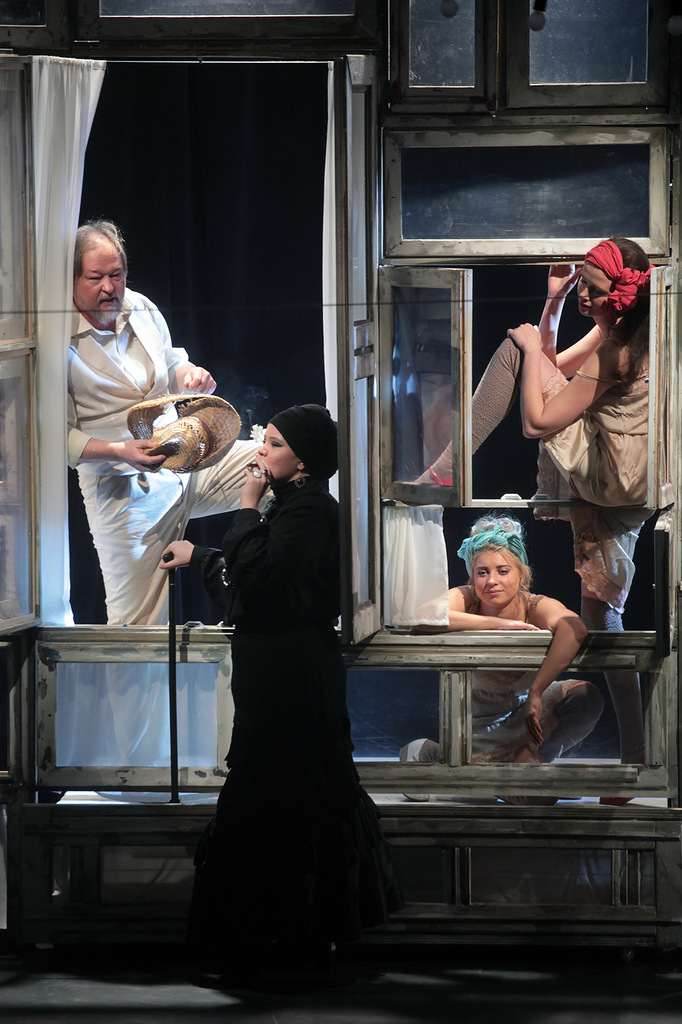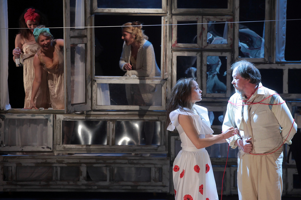 «Вспоминая моих несчастных шлюх» — это яркая и насыщенная действиями постановка. Чего стоит поездка нашего Мудреца на велосипеде по камерной сцене «Мастерской»! Зрителям с первых рядом наверняка было не по себе от мысли, что лишь одно неловкое движение — и актер может упасть со сцены. Общие танцевальные номера, игры в переодевания из путан в журналистов и постоянно появляющаяся постель со спящей Дельгадиной (юной девственницей) – все перестановки для очередной мизансцены могли показаться суетливыми и даже неповоротливыми, если бы не общая стилистика спектакля. Иногда казалось, что главные персонажи здесь не Мудрец и Дельгадина, а все шлюхи из борделя, ведь именно они создают массовку, атмосферу. Эти красивые, раскованные женщины, обладающие всеми неотъемлемыми для их профессии качествами, создавали именно ту атмосферу, которую хотелось увидеть, собираясь на спектакль по «Шлюхам» Маркеса. Именно эти персонажи стали самыми яркими, интересными, а главное, шумными – именно такими представляешь себе колумбийских шлюх. В противовес им стоит образ Дельгадины, как назвал ее Мудрец, вспомнив песенку из испанского фольклора, где несчастную девушку запирают в башне умирать от жажды. Дельгадина всегда молчит. Он видит ее спящей, и она лишь бормочет что-то под нос, она приходит к нему в видениях и слегка смеется, но все же нема. Этот загадочный, почти мифический образ сводит старика с ума, бывает, он думает, что ее и вовсе не существует, настолько она кажется нереальной. Хороший ли это персонаж? Не думаю, ведь как бы чиста она ни была и какой бы невинной ни казалась на фоне остальных путан, она все же изо дня в день остается в борделе в надежде продать себя. В целом здесь нет полностью отрицательных или положительных героев, здесь в принципе нет героев, есть живые люди, которые хотят отдавать, получать и чувствовать, они все чего-то ждут, каждый на что-то надеется. Такие персонажи близки зрителям, ведь они также состоят из плоти и крови, ошибок и неудач, каждому из них сопереживаешь, ведь каковы бы ни были внешние условия, эти люди не черствеют, они продолжают жить, любить и верить.