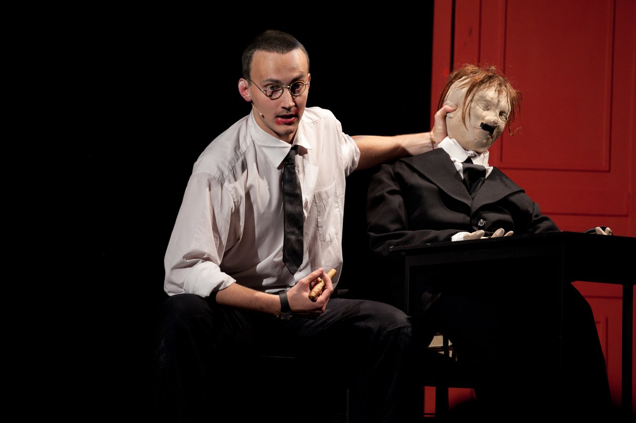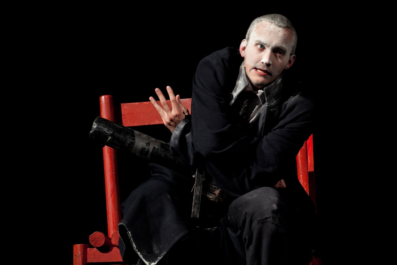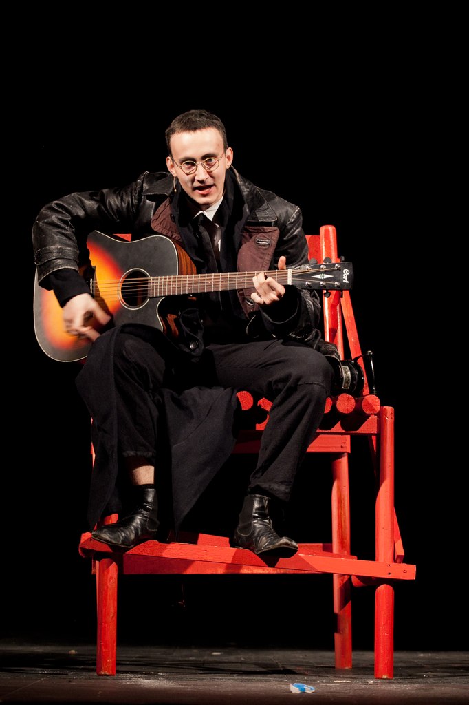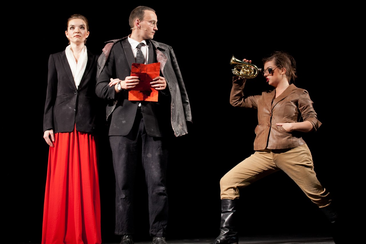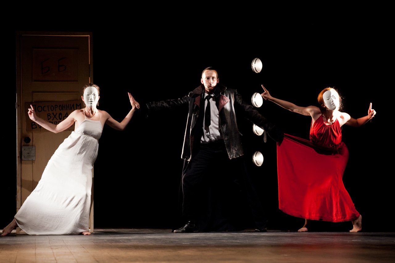 Среди черно-красного хаоса в центре сцены стоит белая дверь с двумя надписанными буквами «Б.Б.». Дверь открывается, и выходит сам Брехт (Сергей Волков), который впускает зрителя в свой особый мир. А его мир — это театр. Театр яркий, театр говорящий, даже кричащий об актуальном. Его мир – это страшные мировые события, которые он не принимает, но не реагировать на которые он не может. Его мир – это любовь. И все эти три темы переплетаются, связываясь в тесный узел, развязать который уже невозможно.