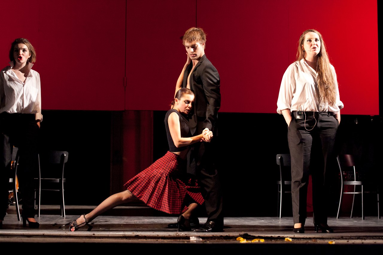 Весь актерский состав — недавний курс Анны Алексахиной — существует как единый организм, как нечто такое масштабное и многоликое. Они не просто восстанавливают время, они его проносят в себе, они его вбирают в себя до мелочей, до деталей и выплескивают во всевозможных формах (танцы — танго и фламенко, песни — зонги), в разнообразных ракурсах, с точек зрения разных людей: о себе и о своем отношении к Брехту говорит и его жена Елена, и его любовница Маргарет.