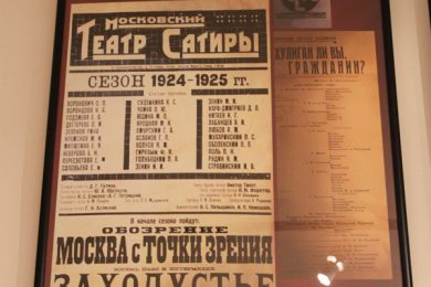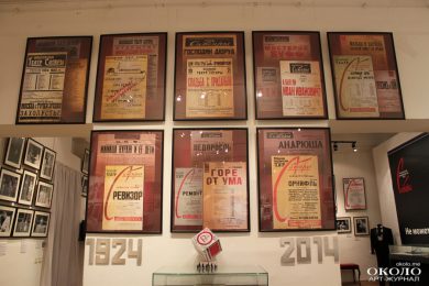 Еще очень ценным экспонатом является изображение первого плаката Театра сатиры к его самому первому спектаклю-обозрению на злобу дня. К большому сожалению, оригинал плаката сохранить не удалось. В дальнейшем театр часто ставил сатирические обозрения, о чем свидетельствуют другие висящие на стенах плакаты.