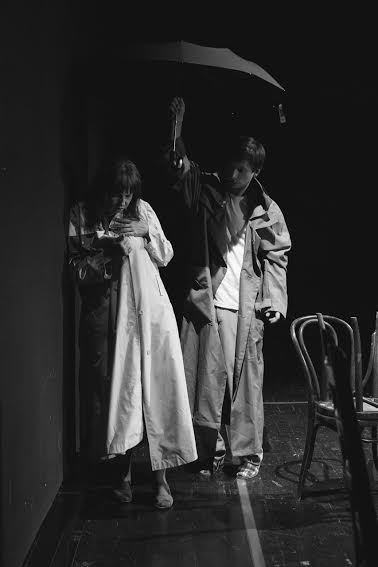 На сцене двое: Она (актриса Молодёжного театра на Фонтанке Регина Щукина) и Ангел (актер Театра «Федерация N» Станислав Толстов). Оба в нелепых плащах, которые так часто носили в 80-90-е годы прошлого века. Ангел похож на тихого, робкого сумасшедшего. Он приходит с потрёпанным саквояжем, переобувается в тапочки, достаёт термос с чаем и слушает Её, периодически крайне удачно комментируя ее рассказ детскими стишками. А Она говорит. Говорит взахлёб. Говорит так, будто задохнётся, если не выплеснет сейчас свою историю. А история настолько обычная и знакомая многим, что невольно начинаешь думать о существовании во Вселенной некого сценария человеческих взаимоотношений.
