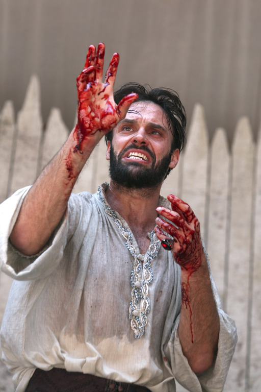 Разумеется, отдельного внимания заслуживают ключевые персонажи пьесы – чета Макбетов. И тут так и хочется применить методы психоанализа. Их отношения в ряде моментов напоминают скорее схему «мать-сын», нежели «жена-муж». Леди Макбет в исполнении потрясающей Саманты Спайро, словно библейская Ева, соблазнившая Адама яблоком, провоцирует своего супруга на первое убийство во имя власти. Макбет, воплощённый Джозефом Миллсоном, не достаточно решительный для того, чтобы «идти по головам», нуждается в уговорах и воодушевлении. Леди Макбет то мурлычит кошкой, то кричит и ругает мужа за медлительность и отсутствие хладнокровности в поступках. Она спешит доделать за ним начатое, будто за нерадивым бестолочью-сыном. Как известно, неуверенные в себе мужчины частенько самореабилитируются за счёт физического унижения женщин. Вот и новоиспечённый правитель Макбет, как бы мстя толкнувшей его на тропу греха жене, во время одного из монологов начинает душить её. А после, недоумевающую и напуганную, уводит за кулисы, придерживая за шею, словно провинившегося холопа. По реакции леди Макбет мы понимаем, что ранее она не подвергалась подобному обращению. А в последующие её выходы на сцену уже не вызывают удивления синяки и ссадины на её теле.