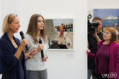 Встреча с ней продлилась около часа, первая половина которого была посвящена демонстрации работ Мартина Парра, не представленных на выставке. Андреа разделила фотографии Мартина, сделанные в разных странах, на группы, наглядно демонстрирующие, на каких деталях и процессах фотограф концентрирует свое внимание. Это и атрибуты туриста, такие как панамки, зонтики, солнечные очки и плащи дождевики, и типичные способы времяпрепровождения, вроде посещения музеев и фотографирования на фоне достопримечательностей, покупка сувениров и тому подобное.