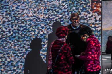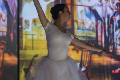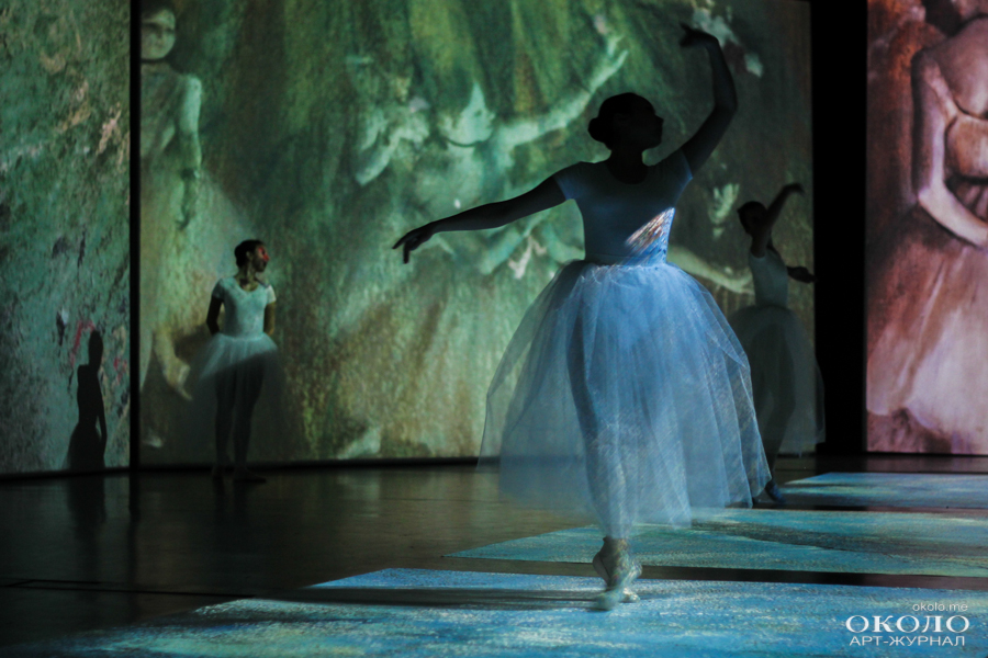 Помимо самих работ, на отдельных экранах приводились цитаты творцов – как на русском, так и на английском языках. Вообще, вся выставка была отлично подограна под гостей нашего города, не владеющих великим и могучим. А во втором зале периодически чаровали отточенными движениями и тянули к прекрасному три очаровательные балерины.