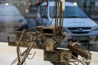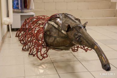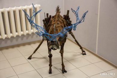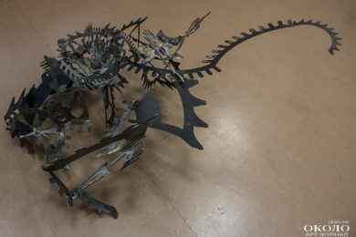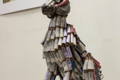 Еще одна работа «Заяц» — это целый проект. Он состоял из двух скульптур — зайца и собаки, которые смотрят друг другу в глаза. При этом заяц сделан из тех патронов, которыми убивают зайцев. Скульптура призвана обратить внимание на проблему защиты животных.