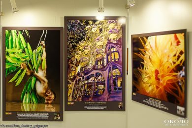На некоторых фотографиях запечатлены архитектурные сооружения: Дом Бальо в Барселоне, построенный в эпоху модерна (ныне – музей), привычная для петербургского глаза Дворцовая площадь или же ночной Токио и др.: