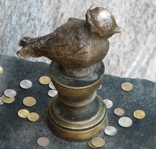 И самым известным героем нашей статьи, конечно же, будет Чижик-пыжик. Памятник персонажу шуточных песенок был установлен 19 ноября 1994 года у Первого Инженерного моста, рядом с Михайловским замком. Эта маленькая птичка является одной из самых известных достопримечательностей города. Место установки памятника выбрано не случайно: неподалеку раньше располагалось Императорское училище правоведения, студентов которого и называли чижиками-пыжиками (за расцветку их мундиров, напоминавшую оперение чижей, и форму шапок). Чижик-пыжик — самый маленький памятник в Петербурге, его высота – 11 см, а вес – 5 кг. С этой маленькой скульптурой связанно несколько поверий. Первое из них гласит: если загадать желание и бросить монетку так, чтобы она осталась лежать на постаменте, желание непременно сбудется. Вторая подходит молодоженам: согласно ей, если жениху удастся опустить на веревке наполненную водкой рюмку и чокнуться с клювом чижика, не разбив её, то в семье будет царить счастье и благополучие.