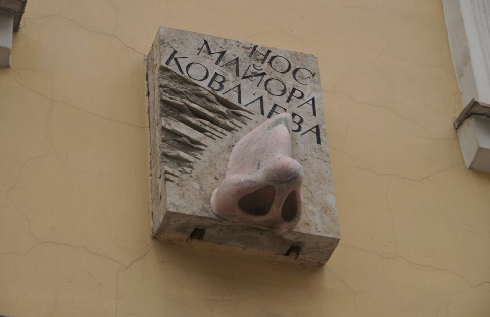 Одним из самых необычных является барельеф, установленный в честь Носа майора Ковалева, на фасаде дома 36/11 по Вознесенскому проспекту, где и проживал его хозяин. Памятник Гоголевскому герою был открыт еще в 1995 году, когда в городе проводился фестиваль сатиры и юмора «Золотой Остап». Нос выполнен из розового мрамора, привезенного с родины самого писателя, и вмонтирован в плиту из серого известняка. Размер плиты составляет 60 см в высоту и 35 – в ширину. Но немногие знают, что это не единственный памятник данному персонажу в Петербурге, а случилось так потому, что, как и в книге, однажды, сентябрьским утром 2002 года, нос отправился погулять. Несмотря на то, что изваяние весило свыше 100 кг, в один день оно попросту исчезло. После года безуспешных поисков была изготовлена копия, которая несколько меньше оригинала и имеет бородавку на кончике. Когда в 2003 году новый барельеф уже готовили к установке, заплутавший оригинал нашли на Средней Подьяческой улице, на площадке лестничной клетки в доме номер 15. Беглеца вернули на свое законное место, а копию вывесили на фасаде дома № 2 в Чернорецком переулке. Таким образом, в Петербурге оказалось сразу два памятника одному герою.