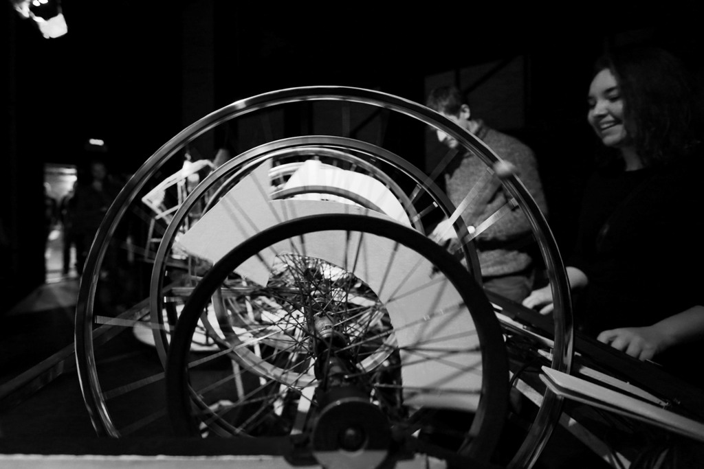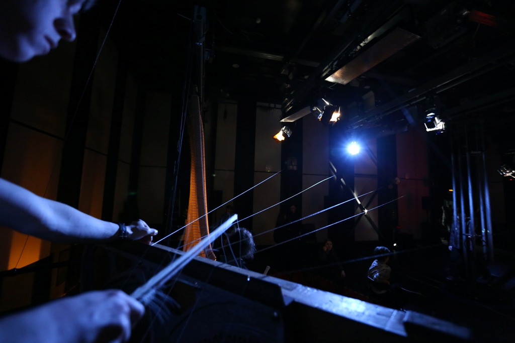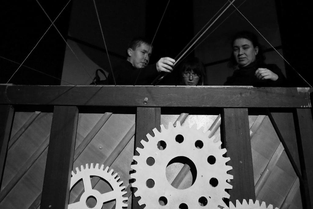 Композитор Александр Жеделёв со своей командой, состоящей из художников, музыкантов, звуковиков и прочих творческих индивидуальностей создал необычную музыкальную композицию, которую и представил на Новой сцене Александринского театра 16, 17 и 18 января. Публика была разновозрастная, и все же многие пришли с детьми. Как обещала программка: «Audiokinetica – это интерактивный, уникальный в своем роде звуковой аттракцион, где зрители являются соавторами, исполнителями и слушателями одновременно». Однако трудно было представить, что нас ожидает. А ждал нас небольшой зал, который благодаря декорациям и атмосфере напоминал скорее запретную лабораторию: темнота, несколько прожекторов, неведомые музыкальные механизмы внушительных размеров, светящиеся алыми, желтыми и прочими цветами, и маленький участок сцены. Началось все с того, что пять человек сидели на стульях и читали сводки новостей. Каждый читал свое, но вместо важной информации был слышен только шум. Постепенно музыканты начали играть на тех самых странных музыкальных инструментах, что еще более усилило атмосферу хаоса и таинственности. Вырванные из контекста, быстрые и неосмысленные значимости ничего не значат. Натянутые над залом струны, звуковое колесо, приводимое в движение путем велосипедных педалей – которое, кстати, более напоминало машину времени – гигантская «музыка ветра» посреди зала, пластиковые трубы, висящие с потолка, продолжали вступать в общую мелодию. Еще много различных механизмов, и звуковых эффектов то выделялись, то сливались в один общий поток. И когда уровень этого информационного шума достиг наивысшей точки, актеры, читавшие газеты, затихли. От этого стих и шум инструментов. Остался лишь звук «музыки ветра» – колокол, как голос гармонии, спокойствия и осознания. И уже вместо газетных новостей мы слышим слова, которые сливаются в песню, и рождают музыку, которая уже не шум, а настоящая музыка.