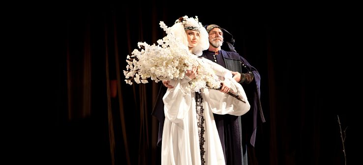 Действие разворачивается на Кавказе. Князь Гудал собрался выдавать замуж свою единственную дочь Тамару (Зоя Бербер). Ей по сердцу выбранный отцом жених: он молод, хорош собой и влюблён в неё. И не он один. Некий печальный Демон (Сергей Кемпо), падший ангел, обозревая с космической высоты красоты Кавказа, замечает красавицу Тамару и теряет покой. В общем-то, покой теряют и зрители – с самого первого появления Сергея Кемпо на сцене. А появляется он крайне эффектно – спускаясь с огромного тернового венка, подвешенного над сценой, выпутываясь из огромных полотен, сковывающих его физические движения, подобно тому, как его принадлежность к инфернальному миру сковывает ростки зародившегося в нём прекрасного чувства.