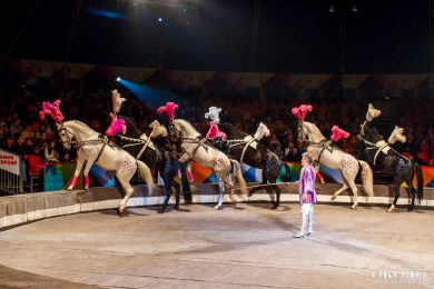 Программу открыла шестёрка лошадей – белые и вороные. Украшенные блёстками и перьями, они то играли в шахматную доску, чередуя масти, то выстраивались тройками, как будто везли невидимые кареты, то переходили на галоп, проносясь мимо зрителей. Маленький мальчик, сидящий рядом, очарованно вздохнул: «Какие красавицы…»