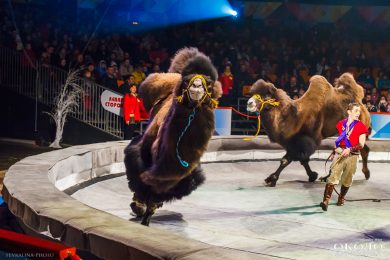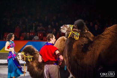 Позже на арену вышли важные и серьёзные верблюды. Они внимательно разглядывали зрителей, невозмутимо, не торопясь передвигались по арене, вальяжно демонстрируя свои умения, – поднимали по команде ноги, ложились и даже стаскивали с дрессировщика рубашку.