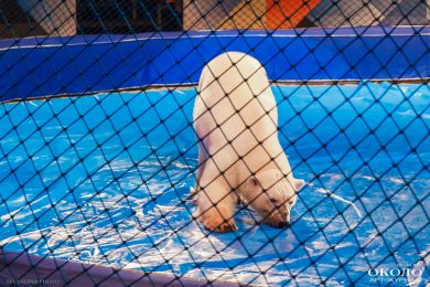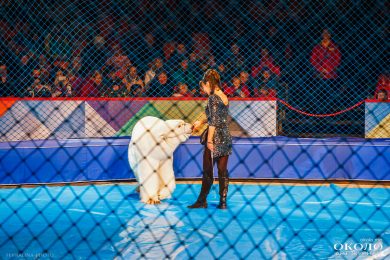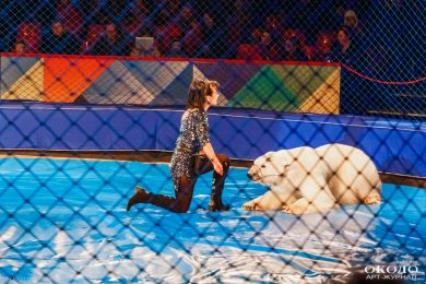 Ну и конечно, звезды программы, которых с нетерпением ждали все, – в конце представления на арену вышли белые медведи, похожие на огромные плюшевые игрушки с тщательно расчёсанной белой шерстью и пушистыми тяжелыми лапами. Вот только они вовсе не игрушечные, а настоящие хищники, поэтому организаторы позаботились о безопасности – на животных были надеты намордники, да и зрителей от арены отделяла сетка. Дрессировщики проделали огромную работу: медведи кувыркались, играли на музыкальных инструментах, танцевали. Уследить, однако, за всеми сразу невозможно, и вот уже двое мишек играют друг с другом, а другой оглядывается и замечает за своей спиной зрителей. Первые ряды замерли, когда он приблизился к сетке и повёл чёрным блестящим носом, принюхиваясь. Но дрессура одержала верх: пушистый артист подмигнул сидящим на первом ряду детишкам и снова вернулся к центру арены.