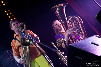Музыка, запущенная до начала, плавно перешла в звучание живых инструментов. Я оторвалась от записей — они уже на сцене! Напряженные звуки… публика в ожидании. Мы с Ольгой огибаем сцену со всех сторон — ищем ракурсы для съемок. Хотелось б попасть на балкон… но Михаил не знал, что я буду писать репортаж, и внес меня в обычный список приглашенных, то есть специального браслетика-пропуска наверх, в VIP-зону, у нас на руках не было. Охранник мягко и словно кокетливо, но бескомпромиссно не пропускает нас и предлагает справиться о браслетах на входе.