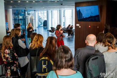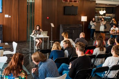 Помимо инсталляций в этот день прошла лекция от преподавателя факультета свободных искусств и наук СПбГУ, к.ф.н. Натальи Федоровой, которая рассказывала о «Технологии языкового искусства». Она затронула тему истории создания современной поэзии, использования различных электронных девайсов, благодаря которым и возможна нынешняя медиапоэзия.