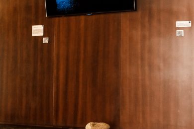 Так, проект Елены Демидовой и Олега Макарова «Мироточение» является некой документацией инсталляции на экране, видео с ее представления. Для этой работы были выбраны случайные книги и тексты, которые потом записали в аудио формате и поместили в несколько (около 20) камней. Когда зритель двигается между ними, произвольным образом выбирается и звучит отрывок поэтической речи. Это некая материализация поэзии, ее воплощение в реальности. Так, когда двигается несколько человек, звучат сразу несколько произведений.