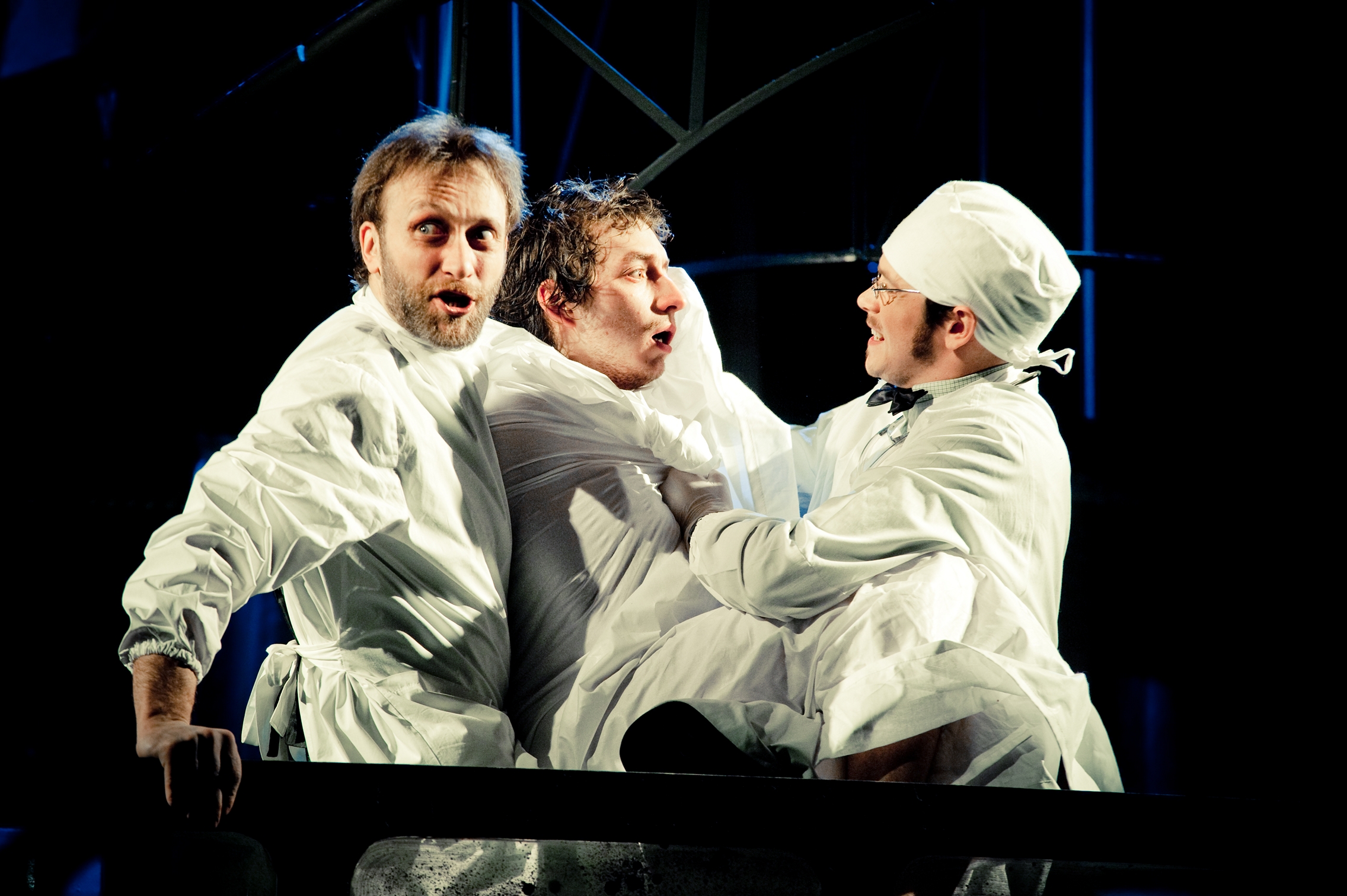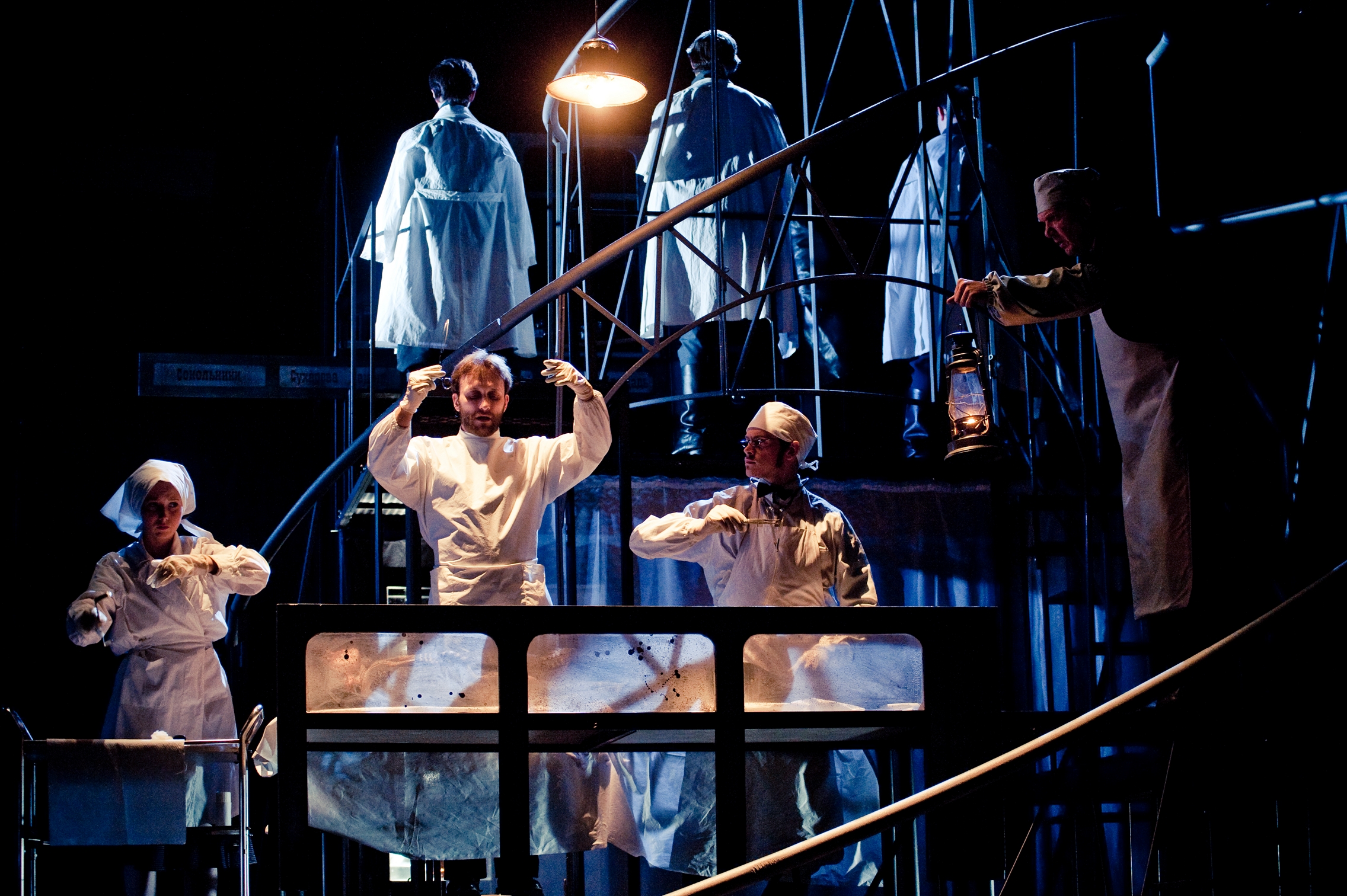 Нет сомнений в том, что спектакль – политическая сатира, как и повесть Булгакова. Декорации похожи на тюремные решётки, на полу лежат грубо оборванные рельсы, по ним заезжают на подмостки «Балтийского дома» пролетарии, пытаясь насаждать новую идеологию. Но рельсы-то дальше никуда не ведут! Сейчас нас смешат Швондеры и Вяземские – такие как они не мыслят широко, не пытаются понять глубокие вещи. Но тогда такие люди были обыденностью. Там, в мире заколоченных дверей и агитплакатов, профессор Преображенский в исполнении Дмитрия Косякова пытается искусственно создать Человека.