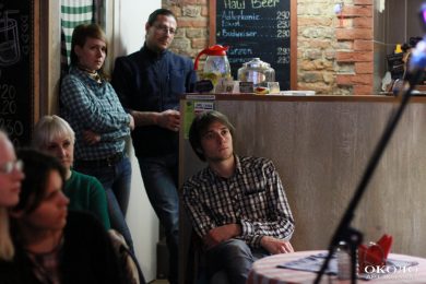 После нее на сцену вышел сам Никита. И, с того момента, когда он подошел к микрофону, зрители стали свидетелями не просто поэтического выступления, а целой истории, рассказанной в прозе и стихах. Никита, один из тех немногих поэтов, которому удалось собрать абсолютно различные стихотворные тексты в единое целое, объединив их общей историей, мотивом, превратив в маленькую киноленту о мастере Боу в головах присутствующих. Поэт ни на секунду не позволял публике заскучать, одно настроение сменялось другим, курьезные и смешные случаи из жизни мастера трагическими и грустными, все это делало его настолько близким и понятным каждому, что оставалось только протянуть Боу руку и сказать: » Здравствуй! Мне все это знакомо, я такой же как ты. » В течение всего вечера зритель постоянно задавался немыми вопросами: » Кто этот таинственный мастер Боу? «- пытаясь понять, сам ли это поэт или это его лирический герой. Но история таинственного героя так и не раскрыла его имени, что, пожалуй, сделало ее еще более интересной и запоминающейся.