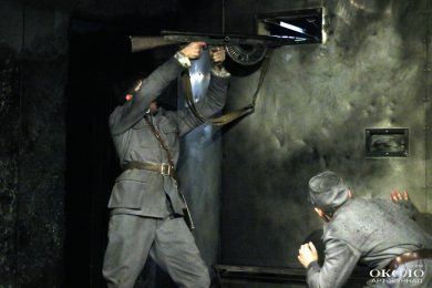 Каждая история спектакля — трагедия, но не исключительное событие, а вполне рядовое. Такова повседневность войны! Погибает в оккупированной деревушке семейство Мареско, и выживший отец (Михаил Гришин) приносит в холщовом мешке останки, чтобы похоронить в семейном склепе, а там сидят солдаты-освободители. Лейтенант отправляет струсившего слабоумного рядового под пули… Воевать ему придется недолго.