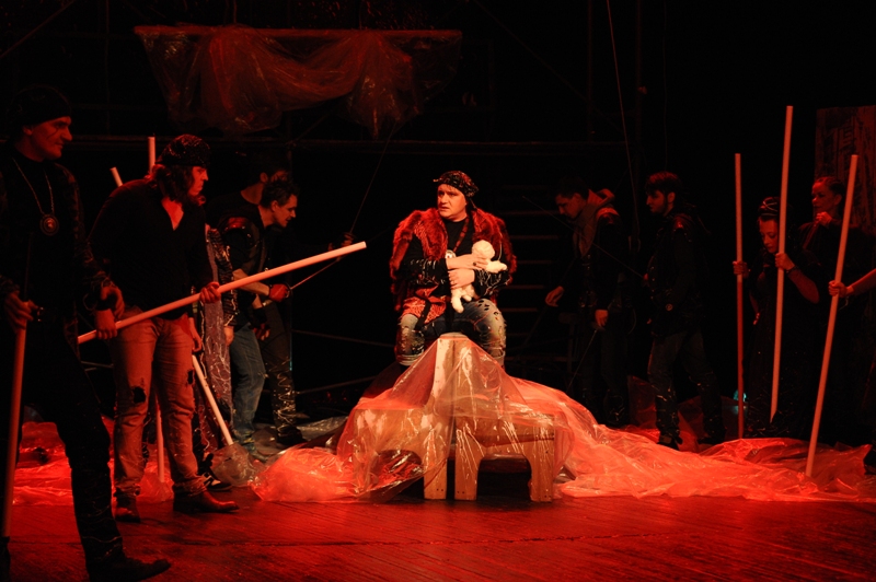 Не стоит напоминать, что шекспировские трагедии по существу своему всегда кровавы. Для реализации техники кулачного боя на сцене в Театр им. М. Горького в Астане был приглашен знаменитый актер-каскадер Нурбек Болотов, тренировки с которым помогли актерам в совершенстве овладеть навыками сценической битвы, временами напоминающей реальную дуэль шекспировской Англии.